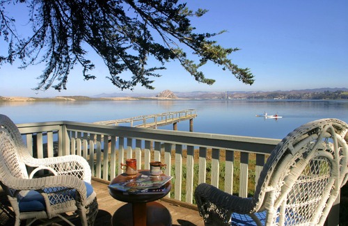 When you step out onto the deck — be warned — you will not want to leave. There you can sit for hours with your coffee or glass of wine and look down along the shoreline, across the bay to Morro Rock, to the sand dunes and the surrounding mountains.
