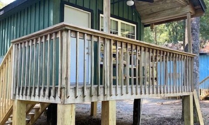 Check this Riverside Cabin on the banks of the Ocmulgee River. From your front porch you can see Zellner Island and Juliette Dam. This one-bedroom cabin has an authentic, primitive feel but features all the niceties of home. The house features a studio set-up, a comfortable queen bed, and a simple kitchen with a microwave and refrigerator. The home also contains a functional yet minimalbathroom, features heat and air, and comes with towels and linens.