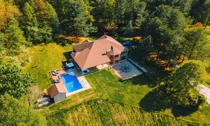 The Grounds at Hocking Hills is the perfect getaway for large families, groups and company retreats located in the heart of Hocking Hills. Sleeps up to 12 guests. Enjoy modern amenities without compromising cozy cabin vibes and unobstructed forest and valley views. At our property, enjoy open concept living space, wood-burning fireplace, full kitchen, natural light, year-round hot tub, full-stocked pond with catch and release fishing, seasonal in-ground heated pool, and vast outdoor patio and fire pit. Pool open from Memorial Day to end of September. 5 min drive from Ash Cave. Many outdoor activities located nearby. Fully renovated in 2022, this home offers a relaxing and comfortable experience for guests. The master suite includes breathtaking views, gas fireplace, queen bed and private ensuite bathroom with double sinks, soaking tub and separate shower. Three more bedrooms in the home share a bathroom with a shower. Off of the main living space in the four season room, take in panoramic views of the property with an optional pull out sofa. Guests access to washer & dryer and 2-car garage with additional parking on paved driveway. Don't miss out on this peaceful, secluded home!
