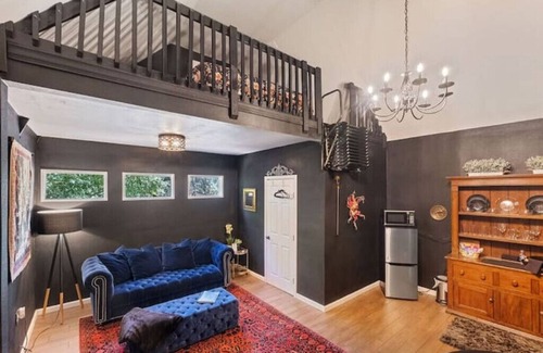 The Haven, located behind The Huntsman, is a 350sqft tiny home tucked in Hidden Hill. It is furnished with a velvet tufted couch, 9 foot shower with rain fall shower head, unlimited hot water on demand, and a 65" smart tv with sound bar. Shares an interior wall with the Huntsman.