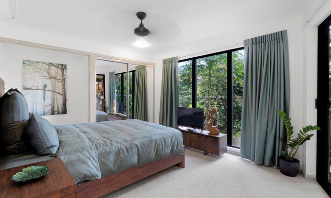 The Heart Stay is accessed via a separate entrance, and the property also offers a large bathroom with a shower and a bath, a separate toilet, a private garden with an outdoor shower and four sunbeds overlooking a stunning tropical mountain view, with fluttering butterflies in arm's reach and the famous Australian tropical daylight birdlife for your viewing pleasure. Stunning rainbows in summer and breath-taking sunsets in winter also frequent The Heart Stray for your enjoyment.