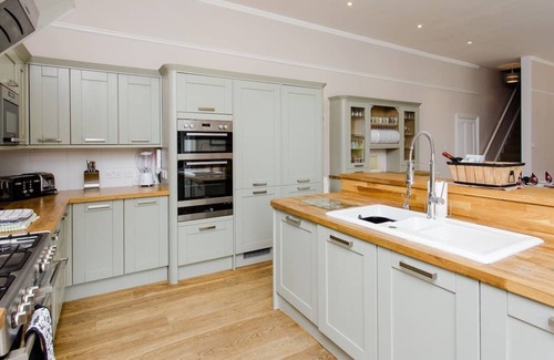Kitchen: Country style kitchen with breakfast bar and large kitchen table and chairs. There is a double electric oven with grill and gas hob as well as an upright oven with grill. There is also microwave, larder size fridge and freezer and dishwasher.