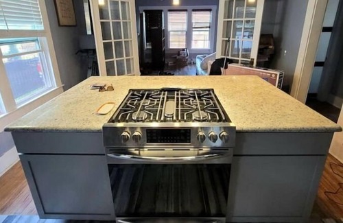 Basically, it's a 2 bedroom one bath. The bathroom was completely demoed by me, and I made a huge standing double head shower with a sitting area. I also demoed the room in front of the kitchen, making it open concept building an island gas grill, air fryer, and oven. I was amazed at how dense the wood was. This house just turned 100 years old this year. it has a huge sunken deck in the back that is shared with the Hidden Gem, my first Air bnb. You will be able to rent both for larger families.