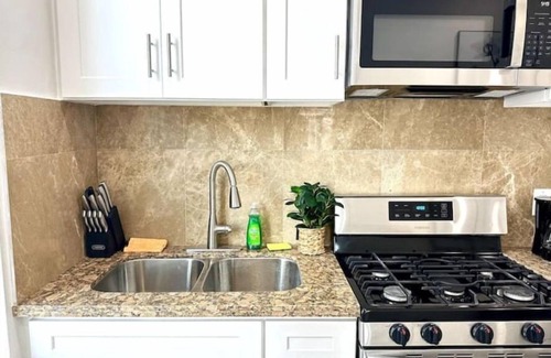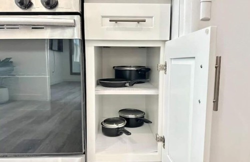 Stove | Oven | Refrigerator | Microwave | Toaster | Water Kettle | Coffee maker | Brita Water Filter | Cooking utensils | Silverware | Oven mitts | Plates and bowls | Mugs, cups, wine glasses | Dining table