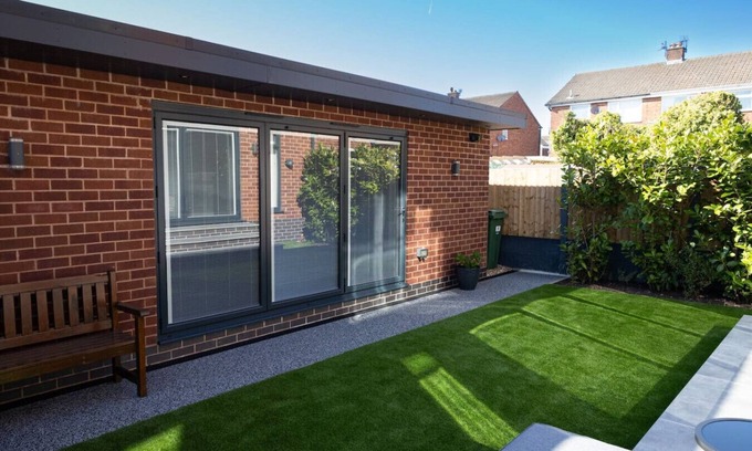The guest house features large bi-folding doors that open up to a beautiful garden, perfect for enjoying fresh air and relaxing outdoors.