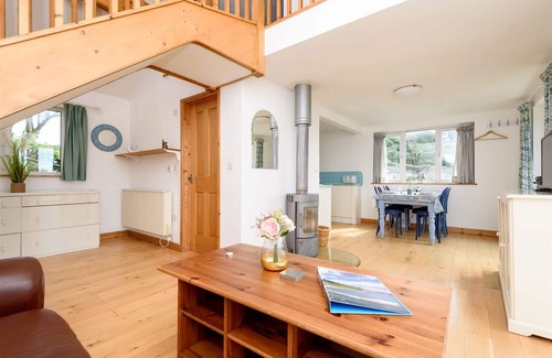 As you arrive, a cobbled set of steps winds up through pretty shrubbery to a decked terrace (please enquire if any accessibility issues), surrounded by greenery it creates a welcoming entrance to the property. Step inside to a light-filled open-plan living area, with a comfortable two-seater sofa, a wood burning stove for chilly evenings, a dining table with seating for four, and a kitchen. Amenities include an electric oven and four-ring hob, microwave, and a fridge with a freezer compartment - everything you need for simple self-catering.