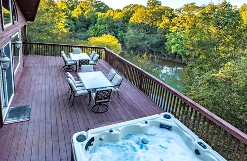 Large, secluded three-story cabin on the edge of the river with a wrap-around covered deck and an 8 person hot tub overlooking a fantastic river view. The top floor of the main cabin has a full bath, private bedroom with a king bed, and a loft area with a twin over full bunk bed. The main floor has a full bath and a king bed in a private bedroom. Downstairs has a full bath, queen bed in a private bedroom and a second room with a wood-burning stove, sleeper sofa, king bed, and twin over full bunk bed. There is an additional connected two-story building with a large game room and a loft with custom built triple king size bunk beds and a single king size bed. This cabin was the former owner's home.