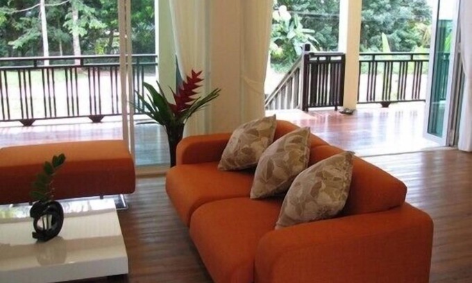 Located 4 km from town and 8 km to Ao Nang Beach, the house is a local architecture, raised 1 m above the ground, set against the backdrop of magnificent limestone hills, and lush green fruit orchards and rubber trees. It has 2 bedrooms, accommodate 4 adults and 3 children, 2 bathrooms, air-conditioned, 160 square meters with large living room veranda and a garden, TV set, Wi-Fi, kitchen, and basic cooking facilities, refrigerator and washing machine. The house is modern, simple, spacious. You will feel at home right away.
