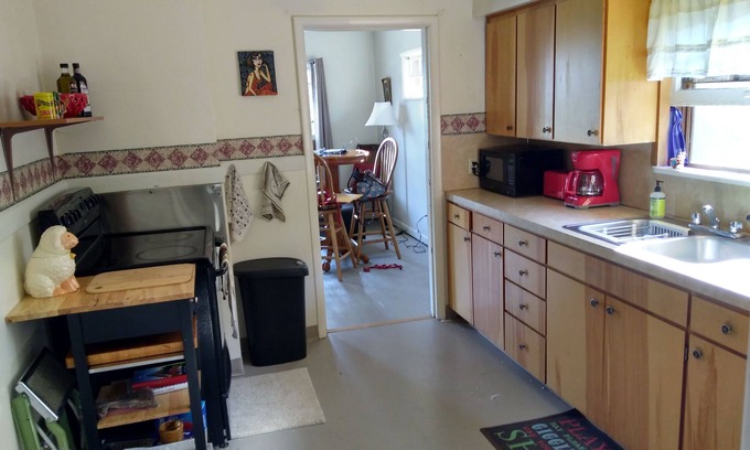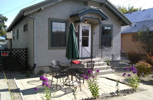 This is a cozy "Roaring Twenties" period cottage. Central heat and air-conditioning. Full kitchen with refrigerator, cook top and oven, popcorn and popper, pots/pans, utensils, coffee, cocoa, sugar, creamer, selection of teas. Olive oils and seasonings provided. Roku TV, DVD player and internet. One bedroom has a queen bed and one bedroom has a double bed and the living room has a sofa hide-a-bed. There is also a highchair and playpen and playing cards/board games in double bedroom closet. Well lit single bathroom with shower/tub/bidet and a cozy living room/dining area with a fireplace and wood laid in the fireplace upon your arrival for that quality time after a day of skiing! AND, YES, WE HAVE PARTNERED WITH ANTHONY LAKES SKI RESORT TO OFFER $10 OFF DAILY LIFT TICKETS FOR EACH OF OUR GUESTS!! Near the Powder River and the beautiful and peaceful "River Walk" which traverses the river and will take you directly to Geiser-Pollmon Park. Also, the home is located essentially across the street from Central Park and the Amphitheater where the summer movie series is shown in August and other events take place during summer months!
