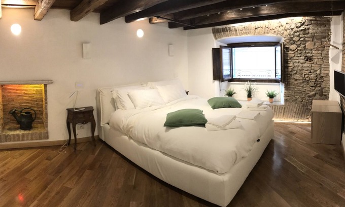 Refined and curated apartment on the first floor, in the historic Via dei Giubbonari, right in the middle of the walkway between Colosseum and Piazza San Pietro. Ancient marbles that belonged to the Roman princes, parts of the walls from which fragments of amphora still emerge: the original character has been carefully respected in the modern renovation, which was followed with passion and competence by a specialist in archeology. It consists of two bedrooms, each with a large double bed and its own bathroom with access from the bedroom, in addition to a common room intended for the living room, where there is a comfortable sofa bed for a possible fifth guest. In the living room there is a dining area, a kitchen with a combined oven (including a microwave), a fridge and a gas hob.