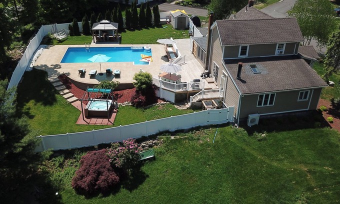 Escape to your home away from home retreat featuring a heated pool, hot tub, and sauna. Enjoy the pool until October 14, 2024, before it reopens in May 2025. This smart Colonial home offers a spacious fenced in yard, deck with large grill, and a cozy fire pit lounge. Just 1 hour from NYC, and close to Woodbury Commons Outlet, Harriman State Park, local breweries, wineries, and restaurants. A perfect spot for everyone to unwind and explore!