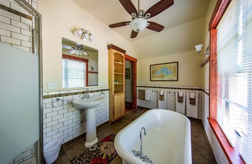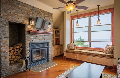 Located only 40 feet from Lake Superior s beach is the Inn at Croftville Road Cottages. This unique and newly crafted building with tall multiple gabled peaks houses 5 vacation suites all with private exterior entrances. The Inn at Croftville Road Cottages #8 provides the gentle sound of breaking waves hitting the shore and spectacular views of Superior. It is designed with romance in mind. This large 1-bedroom vacation suite occupies the third floor attic offering a bird s eye view of Lake Superior. One enters this attic suite from an exterior stairway leading to a second floor covered entry porch. A dramatic interior stairway then winds up to this attic. This inn suite has a living room with a romantic wood fireplace with firewood, a smart TV and DVD player mounted above the mantle, large windows with a window seat looking out to the lake, a futon, a wingback chair with ottoman, and dinette. Just off the dining area is an alcove with a well-equipped full-size kitchen. The bedroom features a plush queen bed, a decorative gas stove, and a partially covered balcony looking high out above Superior. The luxurious bathroom boasts a claw foot soaking tub centered in the windows looking into the forest plus a large walk-in closet. This four-season inn suite is open all year and has wireless internet access. An artesian well provides excellent water for drinking. All linens and towels are provided. The Inn at Croftville Road Cottages #8 sleeps up to 5 people (2 on the futon, 1 on the window seat and best suited for a child).