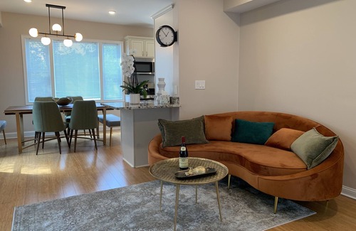 This gorgeous 1,800 sq. ft. 3 bedroom, 2 1/2 bathroom suite at The Inn at Newton Highlands is impeccably designed and decorated. It occupies the second and third floors of the building and immerses you in luxury and style. Its private 800 sq. ft. deck offers stunning views of the village. The space comes with a bonus room. This suite is one of several luxury suites in a small boutique Inn located in the heart of Newton Highlands in a beautiful , fully remodeled historic building.