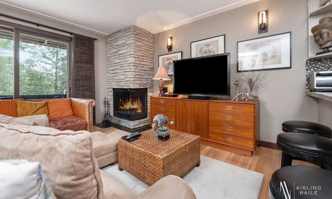 The living room features a 51` big-screen TV connected to a Roku Stick allowing you to log into Netflix or any other streaming service you wish to use. Use the wood-burning fireplace to help set the mood in the evenings.