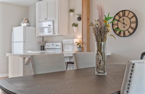 Tucked in the rear of the home, the suite bedroom offers a comfy king bed, full ensuite bathroom, and second flat screen tv. The second bedroom is located at the front of the house with a cozy queen bed and closet space with easy access to the second full bathroom. Off the hallway, is a laundry closet with washer and dryer.