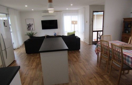 Open plan kitchen with large fridge/freezer, electric stove/oven, microwave, dishwasher, kettle, toaster, Delonghi coffee pod machine (BYO pods), sandwich press. Dining with table/chairs and 2 seater lounge, living area with large smart TV, L shaped lounge, coffee table, reverse cycle split system air-conditioner, sliding doors leading out to rear deck.