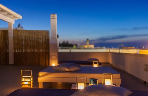 greek style penthouse with colors ranging from white to blue, large private terrace super equipped to feel the thrill of marine life 24 hours a day, which is accessed from the large living room, full kitchen, 1 and a half bathroom, 2 bedrooms of which 1 double and another with 2 single beds but easily joined together, with air conditioning, large entrance, staircase for private use parking is not allowed to organize parties etc. and to accommodate extra guests.