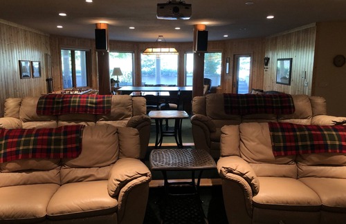 Venture downstairs to discover a haven of entertainment—a sizable game room and a theater room with an adjacent second kitchen. The lower level hosts four more bedrooms, each with its own bathroom, ensuring ample accommodation for every guest.