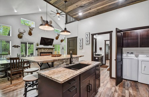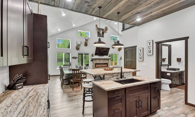 The Lodge is a new construction luxury barndominium. With plenty of space for everyone in the 700+ square foot game room / bar! Granite countertops, coffee bar and a 19' cathederal ceiling are just a few of the custom design touches. The Lodge was designed and built by the owners. Much of the wood work was actually logged right off the property!