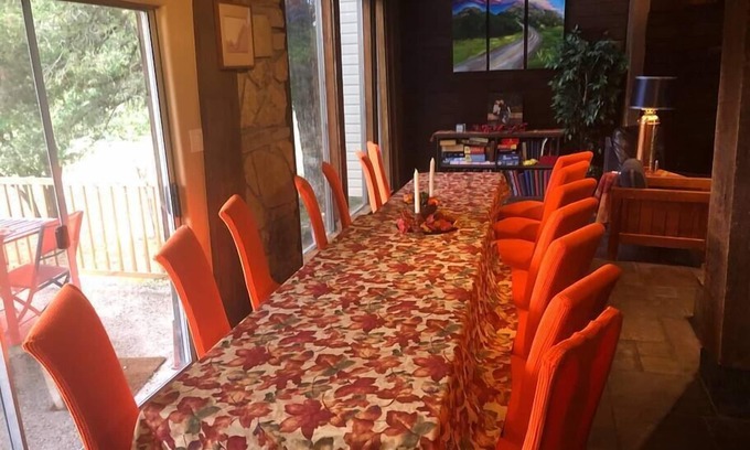 Book 4000’ lodge & barn w pool, hot tub, stone fireplaces, gourmet granite kitchen, slate & tile floors, 2 balconies, & patio, 7 bedrooms,14 (5 kings) beds, sleeps 30, 5.5 bathrooms, 9 secluded acres