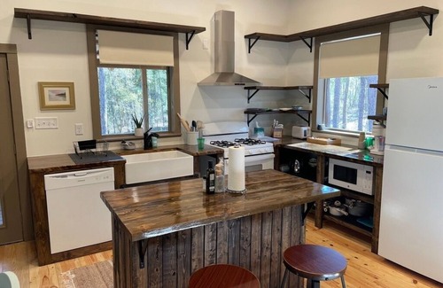Our newest and most modern cabin featuring 3 large bedrooms, sleeping 7 guests with full kitchen and dishwasher, large screened porch with gorgeous forest views and all the comforts of a smart TV, AC, High speed internet and elegant furnishings.