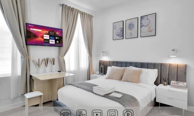 Queen bed | Wall mounted smart TV | Closet | Iron and ironing board | Split AC