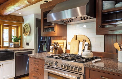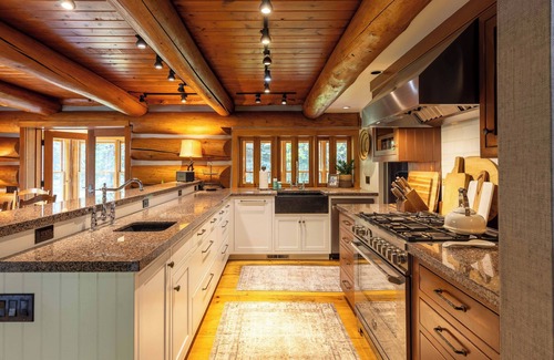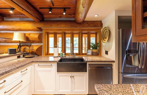 Imagine arriving at a spacious, luxury log cabin set on over an acre of land, with a massive backyard that backs up to a serene aspen grove. This three-bedroom, 2.5-bathroom retreat has everything you need, including a gourmet kitchen with an Italian range and oven, perfect for those who love to cook and entertain. The kitchen is fully equipped with a stone sink, a coffee nook stocked with coffee pods and ground coffee, and all the essentials you need to whip up a feast. The dining room, seating eight, features a built-in wine fridge set within a beautiful stone wall. Just beyond the dining room's double doors, you'll discover a breathtaking backyard complete with a Solo Stove fire pit, a Blackstone flattop grill, an outdoor dining area, and ample lounging space.