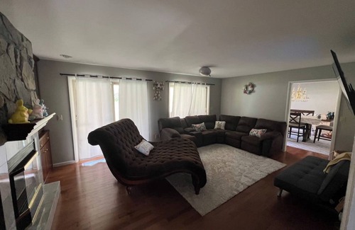 Experience comfort and privacy in our beautifully designed 2,800 sq. ft. home, now combined into one inviting space. This unique setup features four spacious bedrooms, each with luxurious king-sized beds and smart TVs offering Hulu, Netflix, and Disney+. The living room is perfect for relaxing, complete with a cozy gas fireplace and an additional smart TV for entertainment.