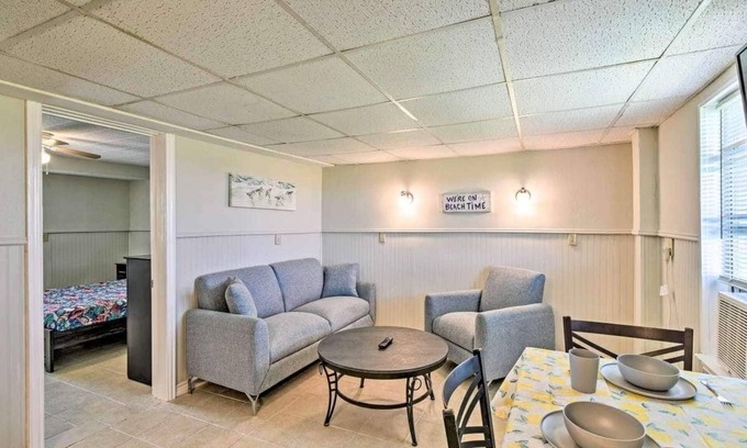 Bench outside of the unit for your use. Outdoor area with picnic tables, and charcoal grills. Please bring your own charcoal and grilling utensils if you intend to use the grill. Neat, clean, safe, and affordable place to stay less than a block from the beach.