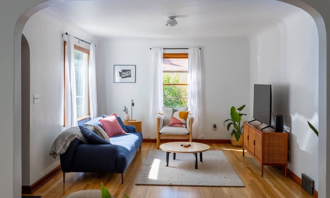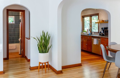 Enjoy all the charm this 1940's cottage style home has to offer! Centrally located just one block from downtown and within walking distance to campus. Enjoy being close to restaurants and all the Pullman community has to offer. You'll feel right at home at The McKenzie BnB! From the moment you step in the door you'll be taken back in time by the perfectly curved archways, original wood trim and windows. The home has been given updates with fresh paint, updated light fixtures, new tile in the upstairs bathroom & downstairs half bathroom, furniture, bedding and decor all while keeping the history of the home. Perfect for a weekend visit, home football game, graduation or other Pullman/Moscow occasion or for a longer stay in the area. There are three bedrooms all with very comfortable mattresses, luxury linen bedding and large built in closets. One of the bedrooms is on the upper floor, while the other two are downstairs. Also located downstairs is a half bathroom, large unique shower room and basement laundry. The kitchen is fully equipped for all your cooking needs so you can choose to stay in and cook a meal, or if you'd like to eat out you're within walking distance to downtown restaurants. The large dining room table comfortably seats six. The living room is right as you enter the home and has a large smart TV and basic cable for you to enjoy a cozy night in. The entire home is heated through central air and is controlled by a thermostat in the dining room. There is also another bathroom upstairs with a toilet, sink and newly installed tile shower above the bath tub (finished May 2023). The home is a true labor of love and project for my husband and I to continually update over the next year. We want whoever stays here to enjoy the home & it's ideal location, so much that they choose to come back or recommend the listing to friends & family!