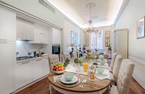 Engulfed by world-famous history, this regal, contemporary apartment with a lift is located on the second piano nobile of this Lucca-based palazzo dating back to the 1200s. Geometrical lines and French windows lead to private intimate rooms with tranquil views of the surrounding medieval buildings and the Guinigi Tower next door. Take a short, scenic walk to the Amphitheatre Square (the oldest Roman Arena today one of the most famous Italian landmarks) and discover a new favorite gelato or espresso spot. Meet your loved ones for breakfast in the formal dining room while gazing upon the ancient buildings of Lucca that line Via Guinigi. Enjoy air conditioning and WiFi while deciding upon the day’s sightseeing plan. Or just hit the streets and wander. San Giovanni church with its bespoke Puccini Concerts, Piazza San Michele, San Martino Cathedral, and Corso Garibaldi are within 5 minutes. A vibrant atmosphere drifts from one frescoed room to another at this beautifully restored piano nobile apartment in Lucca’s Medieval District. Set in the 12th-century Palazzo Guinigi, once the formal residence of the Lords of Lucca, the apartment offers a taste of life in an era of grand entertaining—along with plenty of modern comforts. It’s across from Via Fillungo and next to the Cathedral area, a few minutes walk from the city’s best-known sights. The private living room overlooking the city is the perfect spot for an afternoon spritz and snack while watching the city pass by. The fully equipped kitchen is the perfect place for foodies while the grand dining table is ideal for experiencing cooking classes with a local chef thanks to the in-room kitchenette. Don’t miss the Venus bath: the medieval bathroom of the Lords is now converted into a SPA room featuring a Jacuzzi hot tub to pamper yourself in warm bubbling waters after a day of sightseeing. The apartment’s double entrance leads to a pair of elegant salons that show off its scale and style, with original paintings twining up the walls and colorful frescoes gracing the ceilings. Today, they’re set up as a formal living and dining room whose wooden floors are covered with antique and modern furniture. Off the living area, find a fully equipped 21st-century kitchen, where light-colored cabinetry echoes the delicate tones of the frescoes in the other rooms. The apartment's five bedrooms likewise balance a charming, bucolic elegance with chic modernist touches. 3 suites have king-size beds, one has 2 large-size twin beds and another one has two twin beds, all featuring ensuite bathrooms orned by Carrara marble from the Michelangelo cave. Discovering Tuscany using a car or train can’t be easier: either safe car parking and the Lucca train station are between 5 and 10 mins walk away. From there you can explore the best-kept Italian secrets, such as Florence, Pisa, San Gimignano, Cinque Terre, Volterra, Bolgheri, Pistoia, Montecatini Terme, Livorno, Viareggio, Forte dei Marmi, Chianti, Garfagnana and Siena.Wifi speed: 83 mbps