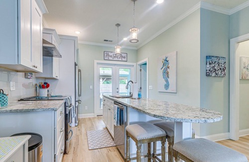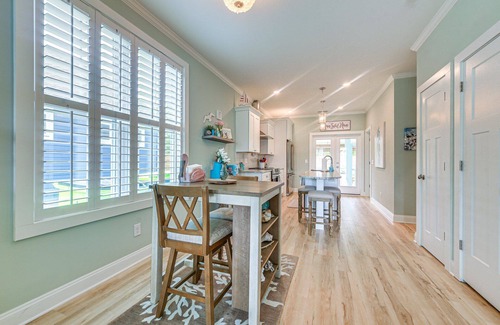 This home is brand NEW and has been tastefully decorated to fit our coastal theme! As you enter the home you will make your way into the large living space. A huge sectional couch, sleeper sofa, board games, and SmartTV make this a great place for everyone to hang out. This space is open to the fully loaded kitchen through a dining area where there is a hightop table. The kitchen has a large island with barstool seats and easy access to the backyard!