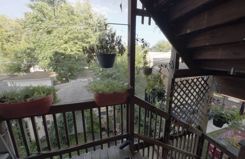 A small porch with plants, seating, and views of the backyard patio. Please keep a minimum of three adults on the porch. Chicago skyline views can be had from the rear porch.