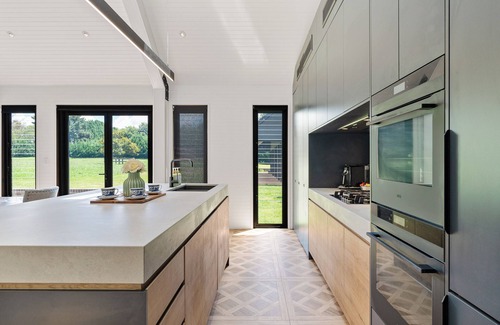 The gourmet kitchen is a chef’s dream, fully equipped with top-of-the-line appliances, sleek stone benchtops, and everything you need to create a delicious meal. The adjoining dining and lounge area is perfect for gathering, with plush furnishings and large windows overlooking the picturesque countryside.