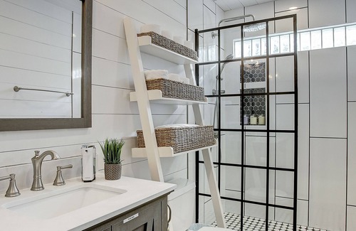 A luxurious farmhouse bathroom equipped with a rain drop shower head is located in the hallway, and is equipped with all toiletries, towels, and shower supplies (conditioner, shampoo, body wash). Beautiful shiplapped walls complete the finishing touches on this well appointed bathroom.