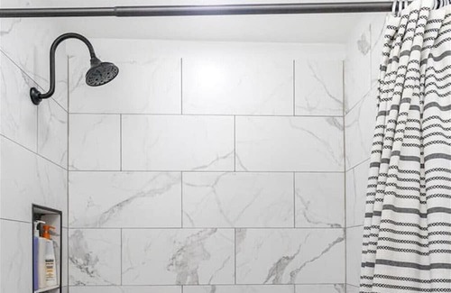 The bathroom was fully remodeled Fall of 2022 and it is surprisingly modern and contemporary for a quaint cabin in the woods. Stone floors, chair height toilet, and a full size tub are just a few of the features.