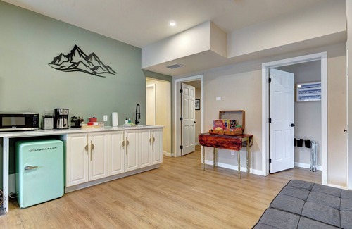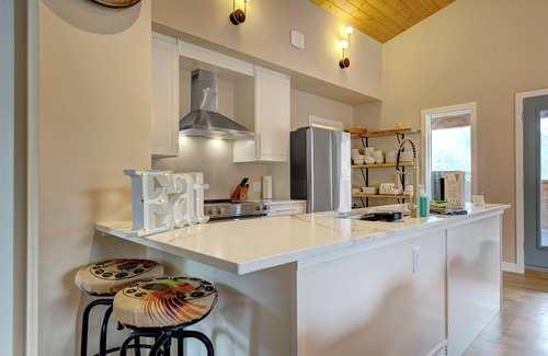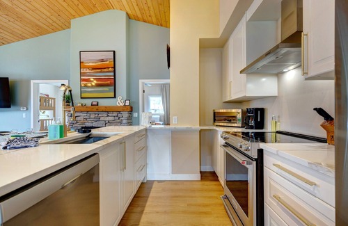 Kitchen: The fully equipped kitchen includes modern appliances, ample counter space, and everything you need to prepare meals for your crew. A dining area (seats 12) and an eat-in bar (seats 2) guests makes it perfect to host large dinners, or challenge your friends to a board game battle.