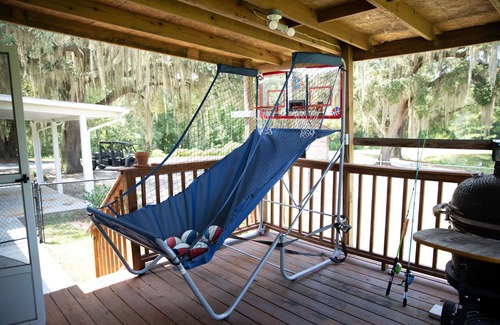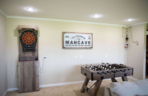 A family-friendly, man cave styled 3 bedroom 2 bath home. Plenty of fun for everyone! Includes Three bedrooms + two full bathrooms, including one ADA-compliant bathroom. Complete with a living room, full kitchen, dining room, two queen beds and one king bed and a spacious screened in back porch.