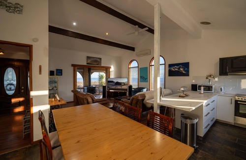 Beachfront property including 4 bedrooms and 2 Bathrooms with the ability to accommodate up to 9 guests. Only 11 km from the heart of Port Lincoln. High ceiling living room and great ocean view. WIFI access available.