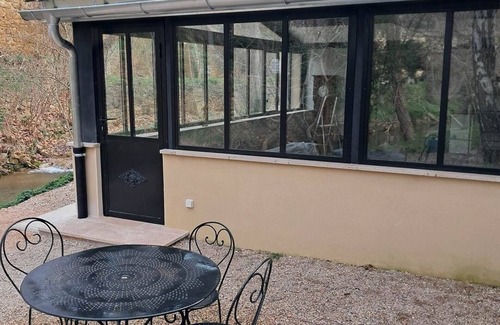 The "old discotheque" suite is located on the banks of the river in the Vieux Moulin property. This suite/apartment of approximately 90 m2 houses a large vaulted stone bedroom, a fully equipped kitchen, a bathroom with a walk-in shower, a large living/dining room, and an independent outdoor terrace. Designed to be a cocoon in a green and serene setting, this historic space is housed in a former discotheque from the 60s/70s where many of our favorite French and foreign actors came to dance (Alain Delon, Romy Schneider, Pierre Richard, Maurice Roné, Patrick Dewaere, among others...)