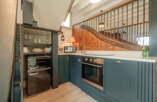 The kitchen is fully equipped with fresh quartz topped bespoke hand painted wooden cupboards, fridge freezer, integrated dish washer and electric oven and induction hob. There is a built in concealed laundry station with washer/dryer, iron and ironing board.