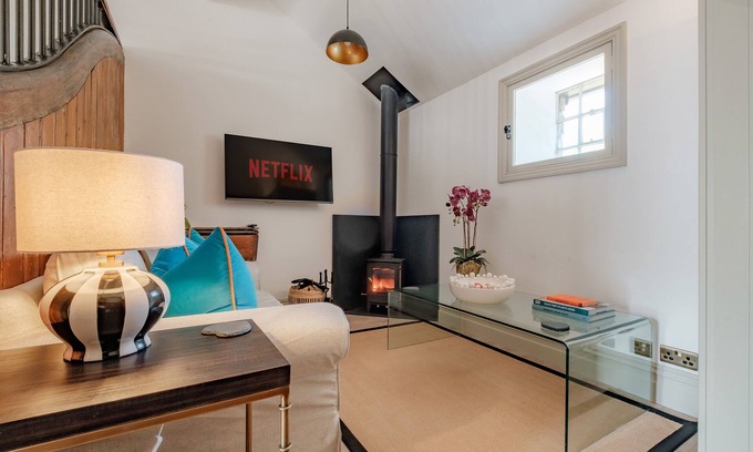 The living space features a traditional log burner for cosy winter evenings, a comfy 2 seater sofa, coffee table with books and board games and a wall mounted smart TV