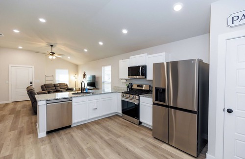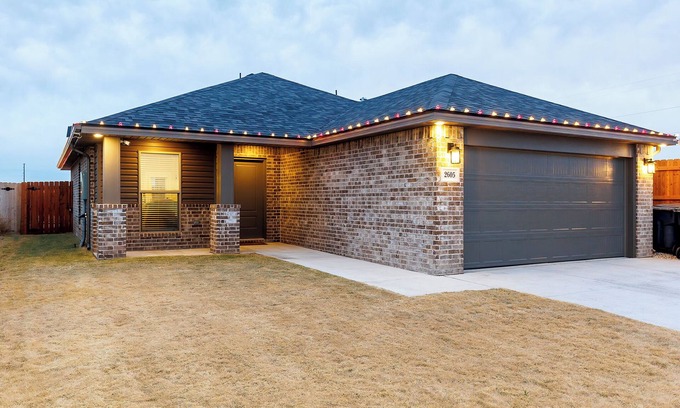 Your adventure begins at this brand new three bedroom charmer, boasting one king suite & two queen, quarters providing comfort, relaxation & entertainment in every room. Enjoy reclining sofas & virtual fireplace. Featuring an open kitchen + hotel style luxury bedding & 2 full baths. Relax & experience that West Texas sky in a private backyard near the fire pit, BBQing, or dominating a game of cornhole! 14 mins. to TTU!
