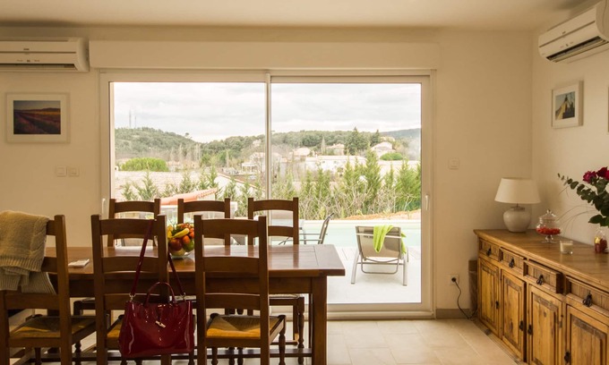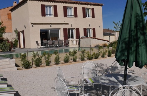 New Bastide on two levels, located in Provence Verte, in a quiet location with very nice open view. The village center is 300 meters with its shops (bakery, restaurants ...). Saint-Maximin-de-la-Sainte-Baume with all shops is 10 minutes by car. Far from any traffic axis, it is only 15 minutes away from the motorway access. Closed ground, parkings. Ideal relaxation and rest with family or friends. Terrace with garden furniture overlooking the pool (8x4x1.4m, electric shutters), sunbathing. Bowling ground. Ping pong table. Modern and quality equipment. Tourist tax and end of stay cleaning included in the rental price.