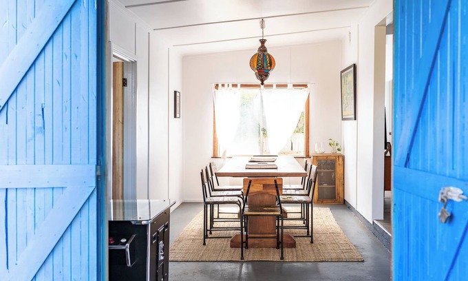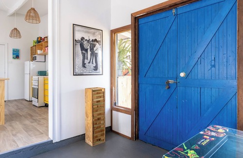 The sitting area has a comfy leather couch and TV. The dining area has direct access through bright blue barn style doors to the outdoor courtyard area, continuing the old-style quirky beach shack vibe there is even a retro space invader machine with 60 games on it and giant Jenga to keep you entertained.