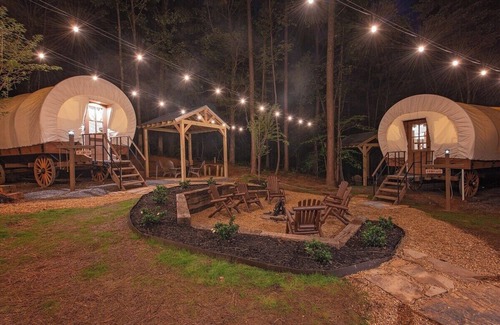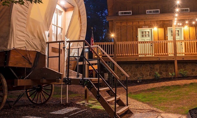 Enjoy roasting marshmallows over a campfire, sleeping under the stars, and waking up to a stunning sunrise just like the pioneers of old–except you'll have electricity, Wi-Fi, a private bathroom, and plush bedding. The Pioneer Wagon at Welcome Valley Village sleeps up to four between a luxurious King bed and twin bunks