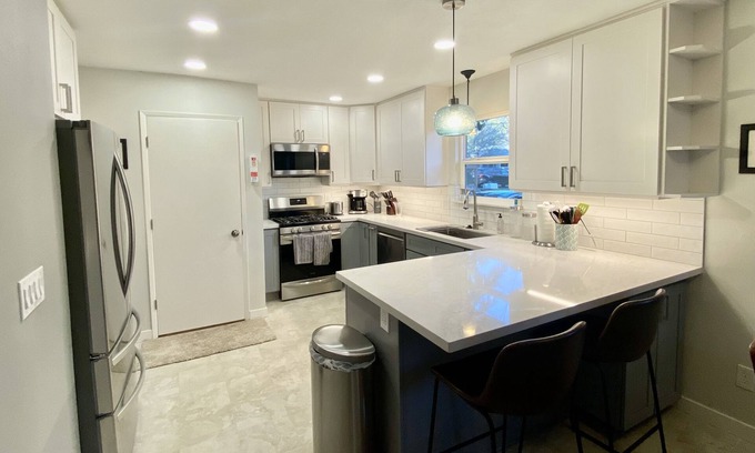 Kitchen: newly remodeled, fully-stocked chef's kitchen with quartz countertops, under-cabinet lighting, gas stove, stainless steel appliances, garbage disposal.