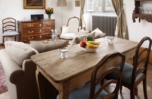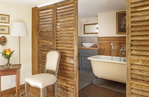 Arranged on three levels, La Poterne offers the opportunity for a unique stay. In the main room which cleverly combines a comfortable living room, a dining table and a very beautiful kitchen, the huge window and its oculus offer a full frame view of the castle. The very soft tones and country furniture from the early 18th century make the place cozy and refined. On each floor, there is a double bedroom, refined and cozy, with a private bathroom in the style of a retro boudoir where you will taste the joys of the old cast iron baths.