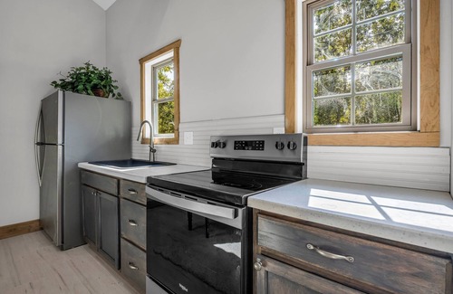 Come experience the uniqueness of Alpine Souths Retreat! It boasts a 9' arched iron door, open floor plan, and a massive deck overlooking the creek, and a giant 200 year old beech tree. The Retreat holds 6 people and has unique character everywhere you look, from the custom pallet doors, to the fractal burned headboard of the Main bedroom. Enjoy the rare privilege of being one of the first to stay because it was finished in Sept 2024. Come experience the outstanding customer care that Alpine South is known for. Dogs are allowed for a charge for $35/night per dog.