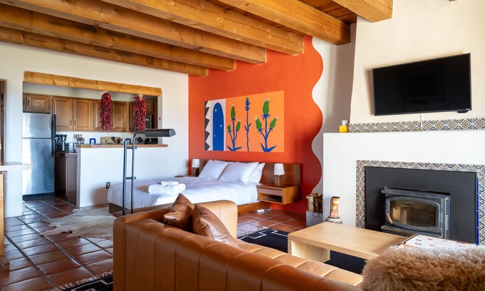 The interior embodies the Southwest. Saltia tiling, traditional viga beams, a hand-painted mural, and a large wood burning kiva fireplace are warm and inviting. High-speed internet, a streaming/casting compatible TV (Hulu, Netflix, Max, Disney+ subscriptions all included), keyless smart locks, espresso machine, full kitchen, private bathroom, and free parking are included.
